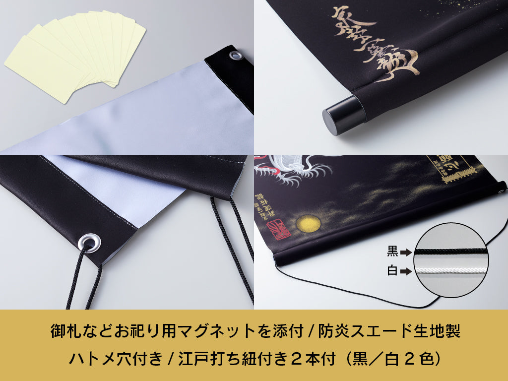 ※軸棒を外して飾られる場合でも、紐や止め具(画鋲、釘、ネジ等)をお使いいただけるハトメ穴付き(表面からは見えません) - 丈夫で切れにくくシンプルな風合いの江戸打ち紐付き(黒/白2色)