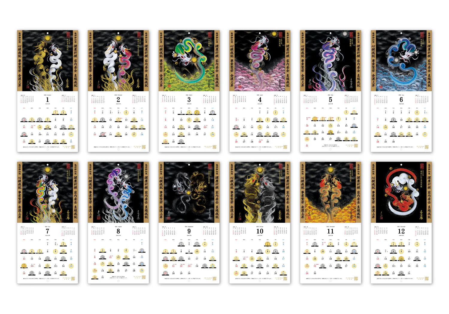 ・御加護、御利益を感じれる ・神々しい ・高揚感 ・守られている ・躍動感/迫力 ・圧倒的な鮮やかさ ・綺麗 ・カッコいい ・強さ ・煌びやか ・繊細 ・勢い ・清らかさ - 縁起が良い吉日とされる日(天赦日、一粒万倍日、大安、寅の日、辰の日、初午、節分、桃の節句、端午の節句)を記載し、該当日を龍が見つめる『月願宝珠』、手に持つ「宝珠」をイメージした意匠にて表現