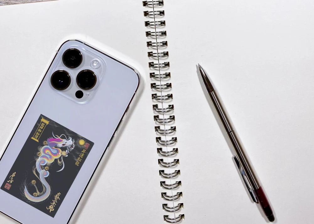 - 『京都一筆龍の御加護/御利益の象徴=胴体部分を一切途切れさせず一筆で描く動画』のQRコード印字ステッカー(2色/2サイズ)を同封お納めいたしております
